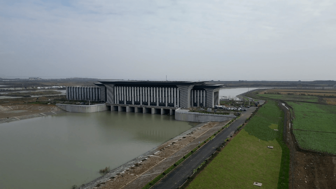 該工程位于肥西縣嚴(yán)店鎮(zhèn)蓮花村的派河口泵站,整體新中式造型,鋼琴鍵的外形,中國古建筑飛檐造型,具有騰飛之勢,同時建筑細(xì)節(jié)吸取音樂符號以及結(jié)合水紋波動的立面肌理,宛如跳動的樂章。